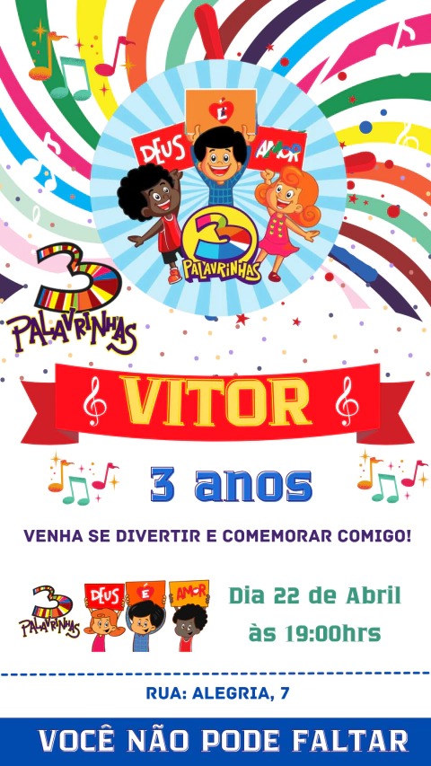“Alegria, fé e música para celebrar!” Este Convite de Aniversário 3 Palavrinhas traz cores vibrantes, notas musicais e clima divertido que as crianças amam. A arte combina ilustrações modernas, tipografia amigável e uma paleta colorida (laranja, azul e vermelho) para um convite fotogênico, alegre e pronto para encantar desde o primeiro olhar.