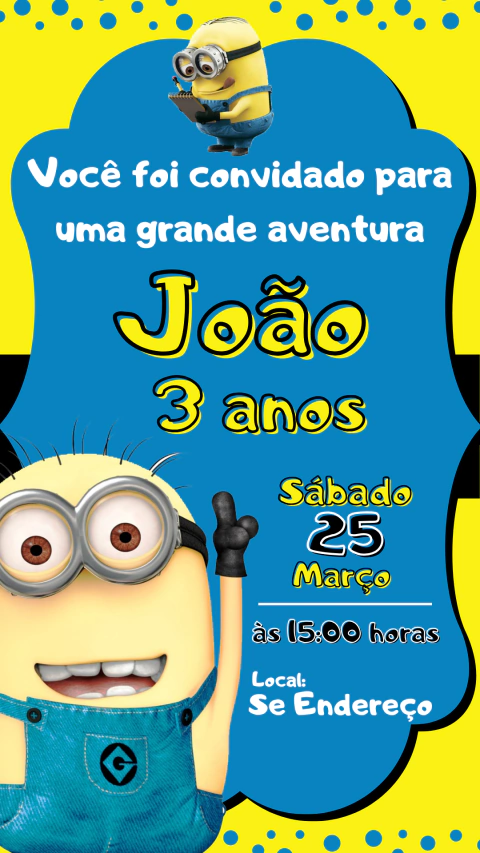 “Bananaaa! Os Minions chegaram para deixar sua festa ainda mais divertida!” Encante seus convidados com um Convite de Aniversário cheio de alegria, cores vibrantes e o humor contagiante dos ajudantes mais famosos do cinema.