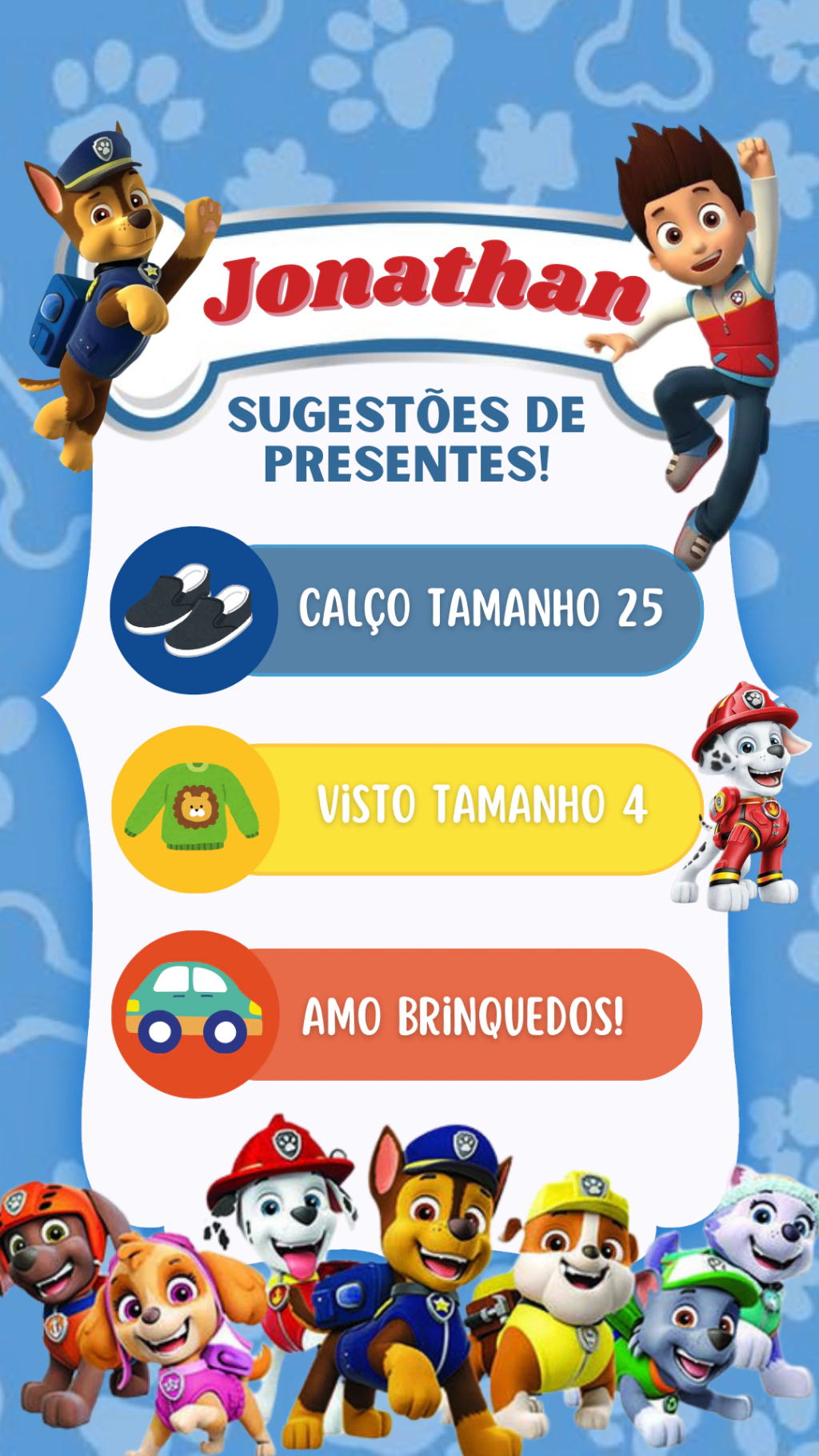 “Nenhum filhote fica para trás: a missão da festa começa no convite!” Deixe seu Convite de Aniversário ainda mais prático e divertido com a Patrulha Canina em versão clicável, perfeita para encantar todos os convidados.