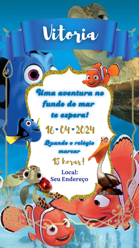 Você recebe uma arte em alta resolução (JPG/PNG), pronta para enviar e surpreender — prática, moderna e com o tema Procurando Nemo em evidência.